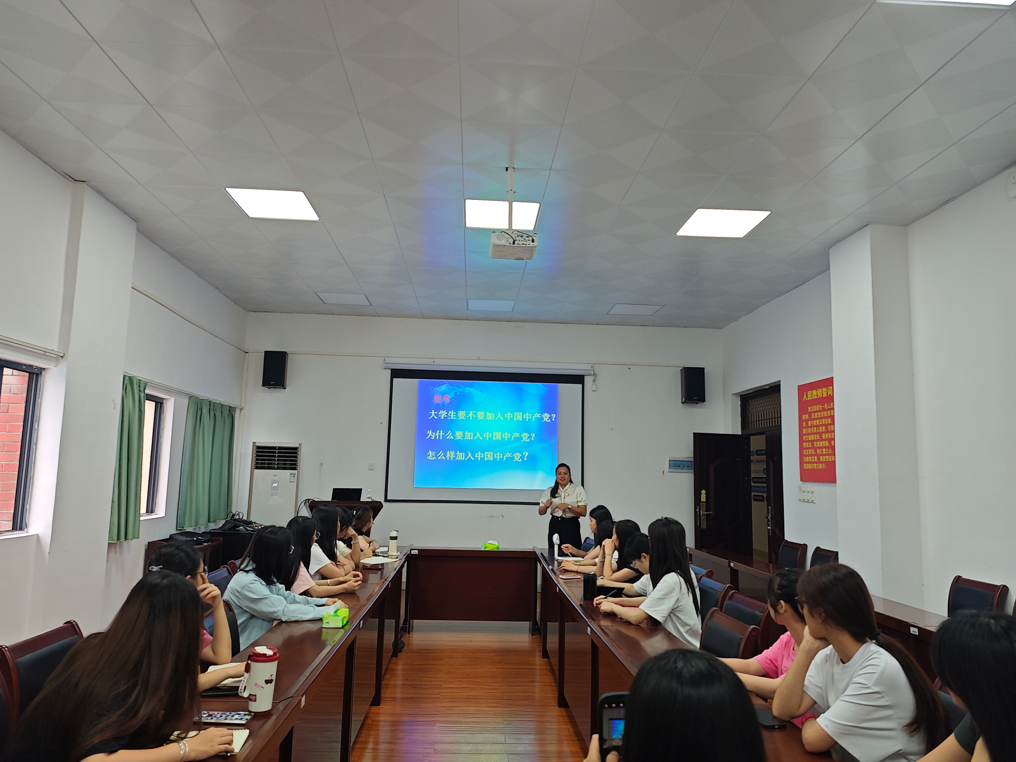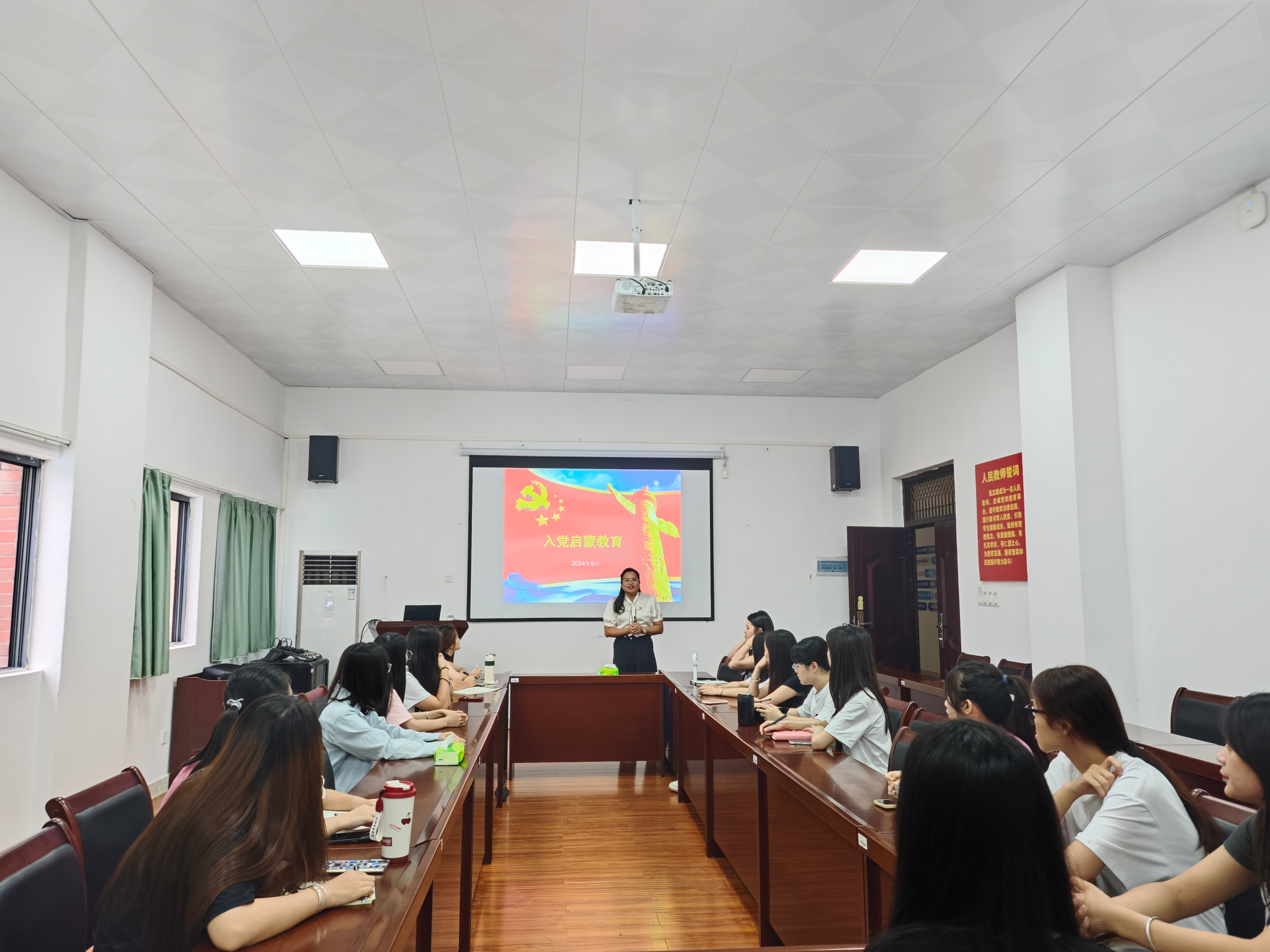 学生第四支部在武鸣校区地化楼C414开展入党启蒙教育,22物流专升本一班、22物流专升本二班未申请入党的同学参加了会议。入党启蒙由学生第四党支部书记黄海嫚老师主讲。
