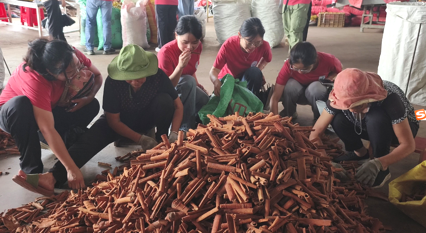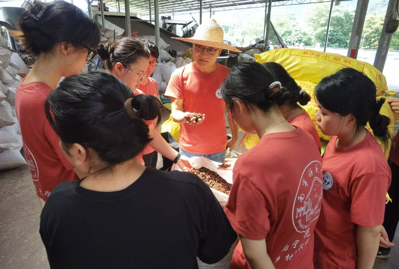 观看完宣传片后,扶隆镇政府工作人员带领实践团队一同前往防城港市世杰香料有限公司进行调研。在工厂,大家观摩了八角与桂皮的分拣、晾晒、加工、运输、销售等一系列严谨有序的流程,在工作人员耐心且细致入微地介绍下,大家不仅学会了如何准确辨别肉桂八角的品质优劣,还调研了香料行业供应链的全产业链细节与数据等。