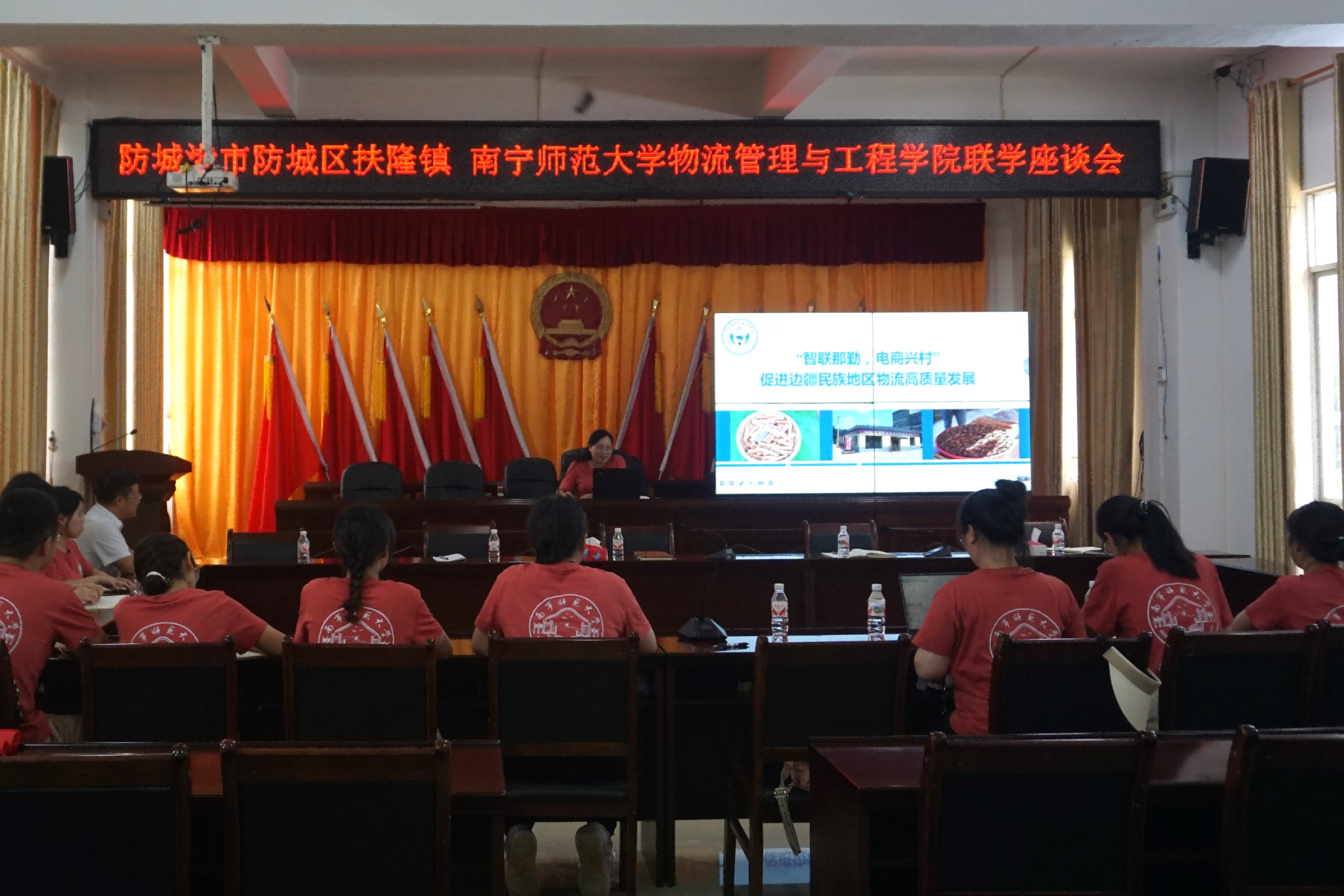 暑期“三下乡”社会实践团成员与中共防城区扶隆镇委员会开展“智慧物流助力产业发展,共绘乡村振兴美好蓝图”联学座谈会。扶隆镇党委书记陈设、镇党委委员、组织委员覃晓、镇团委负责人陈晓雯、镇党政办副主任曾李瑛和男同视频