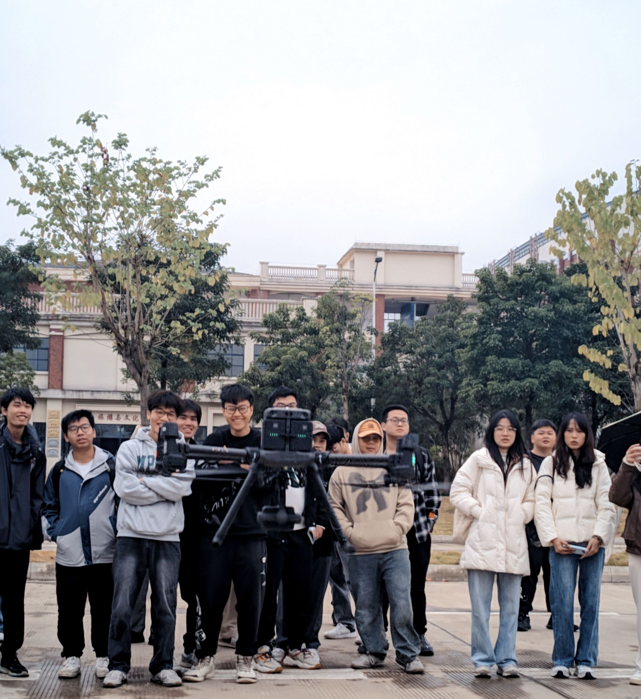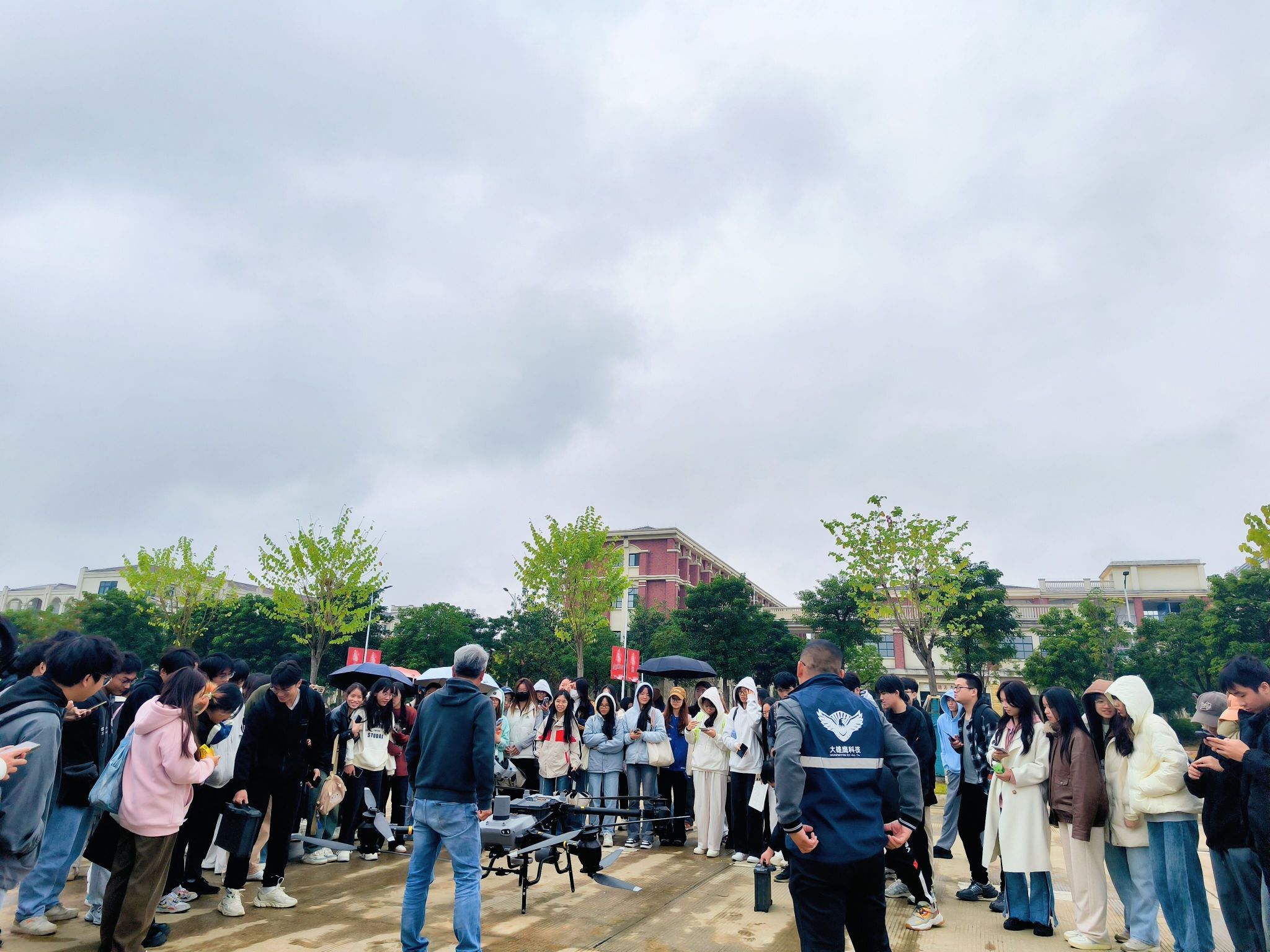 理论学习过后,便迎来了最为激动人心的实操环节。在校内视野开阔、地势空旷的道路上,摆放着三种不同规格大小由广西大雄鹰科技有限公司提供的专业无人机。经过飞手展示后,同学们也亲手操作了小型无人机,尽管天公不作美,阴沉的天气给实操带来了些许不便,但这丝毫没有阻挡同学们对学习无人机技术的高涨热情。在实操培训的间隙,同学们围绕无人机的结构与载重方面的问题,与飞手们展开了热烈的讨论。大家提出自己的疑惑,飞手们耐心地为同学们解答,这进一步拓宽了同学们的知识面,加深了对无人机技术的理解。