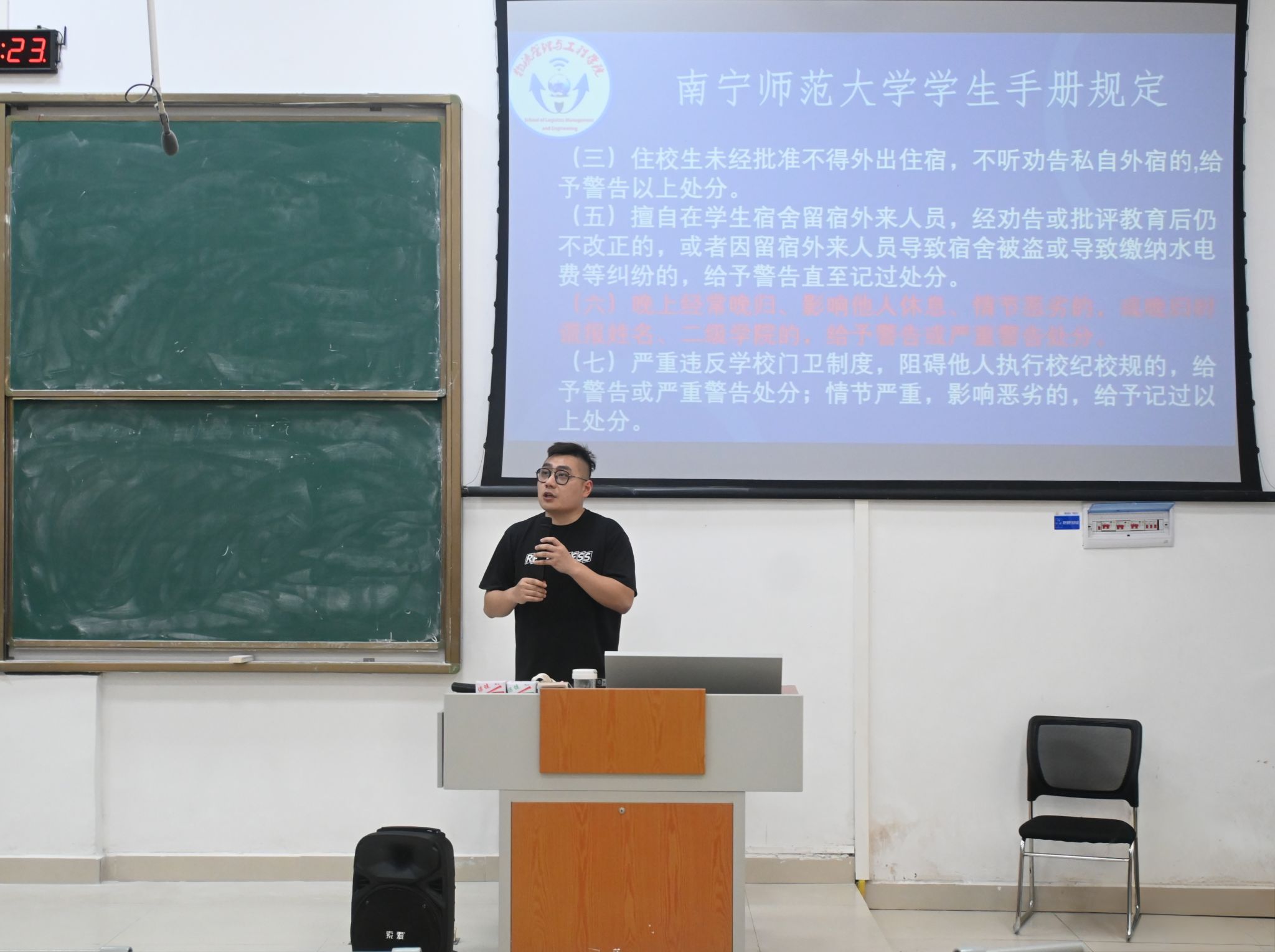刘明炯老师结合近期学院学风督查情况,带领学生们深入学习学生手册规定,同时剖析了在课堂纪律、作息管理等方面存在的突出问题。他指出,部分宿舍出现“晚归不归”等现象,不仅扰乱校园秩序,更影响学生身心健康。他强调各班班长、纪委要强化考勤管理,严格落实学生手册相关规定,坚决杜绝“讲情面、搞特殊”的不良风气,共同维护学院良好学风。