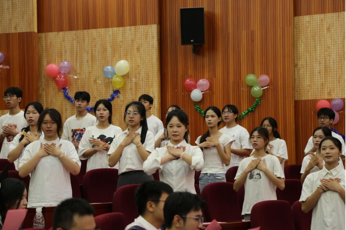 2025届毕业生代表陈经怀、谢明悦、覃华东现场演唱了《再见》《栀子花开》,代表全体毕业生向母校、向老师们表达了感恩之情。学院2022级、2023级、2024学生代表合唱《厚德载物》,为毕业的学长、学姐们送上祝福。最后,全体师生起立,齐唱校歌《芳华人间》。
