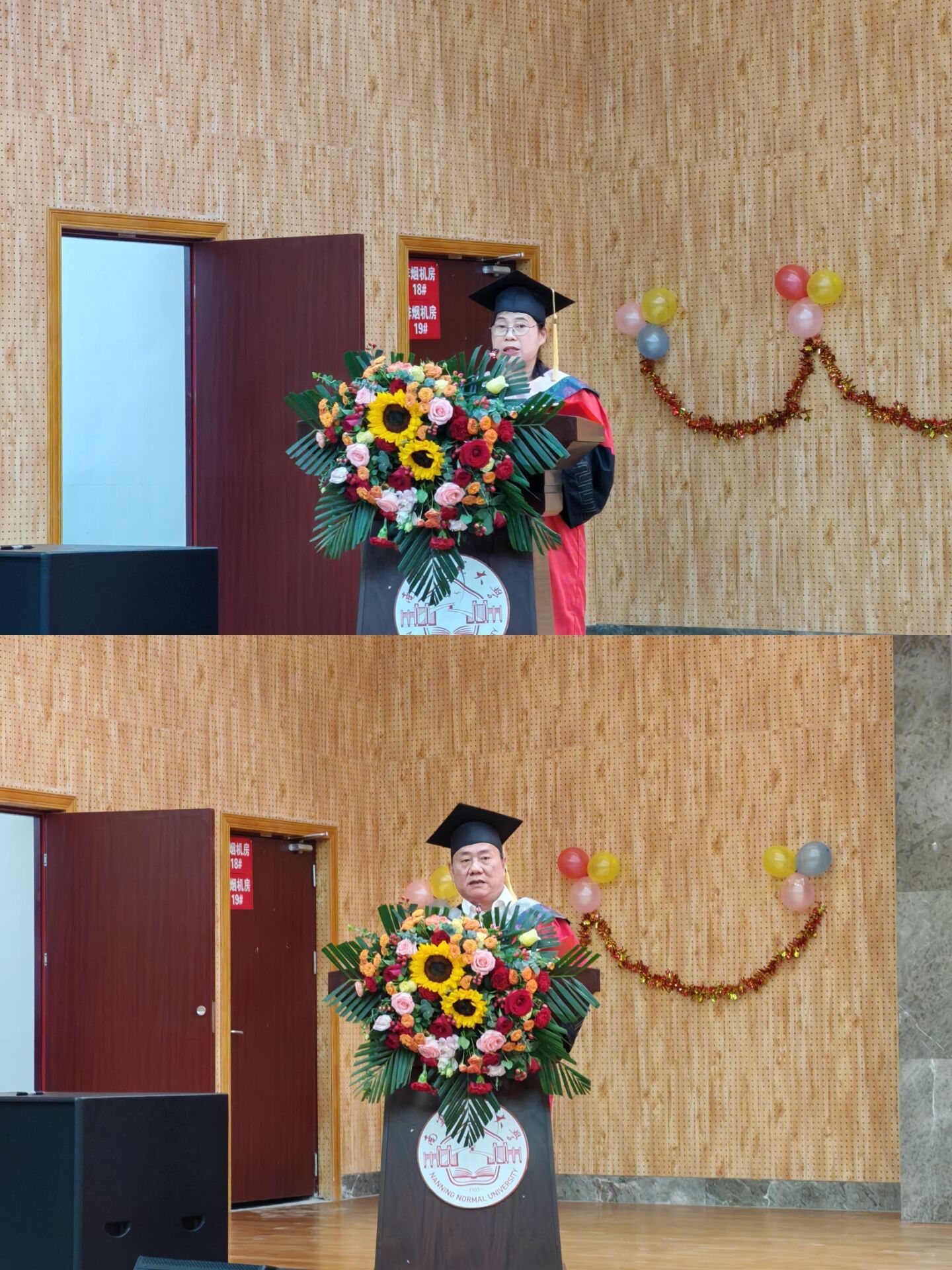 在庄严国歌声中,学院2025年毕业典礼暨学位授予仪式正式拉开帷幕。首先由汪德荣院长致辞,他向2025届毕业生顺利毕业表示祝贺,并肯定了毕业生们的成长与进步,鼓励他们勇敢追梦,书写非凡人生。随后,蔡宏果副院长宣读了2025届本科生学位授予决定,党委陈兵书记宣读了区级、校级优秀毕业生文件。学院学位评定委员会委员为上台的毕业生们一一进行了拨穗,并颁发毕业证书和学位证书。