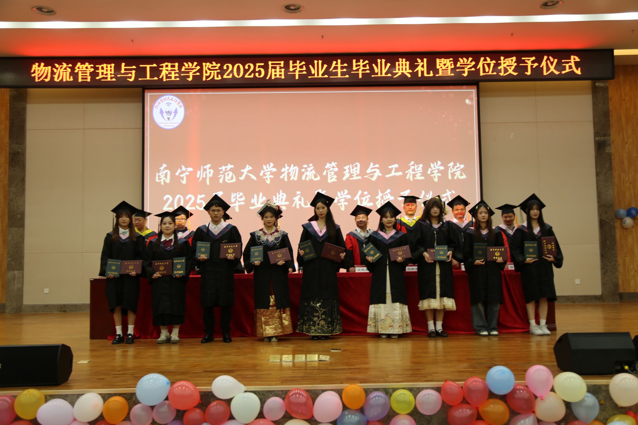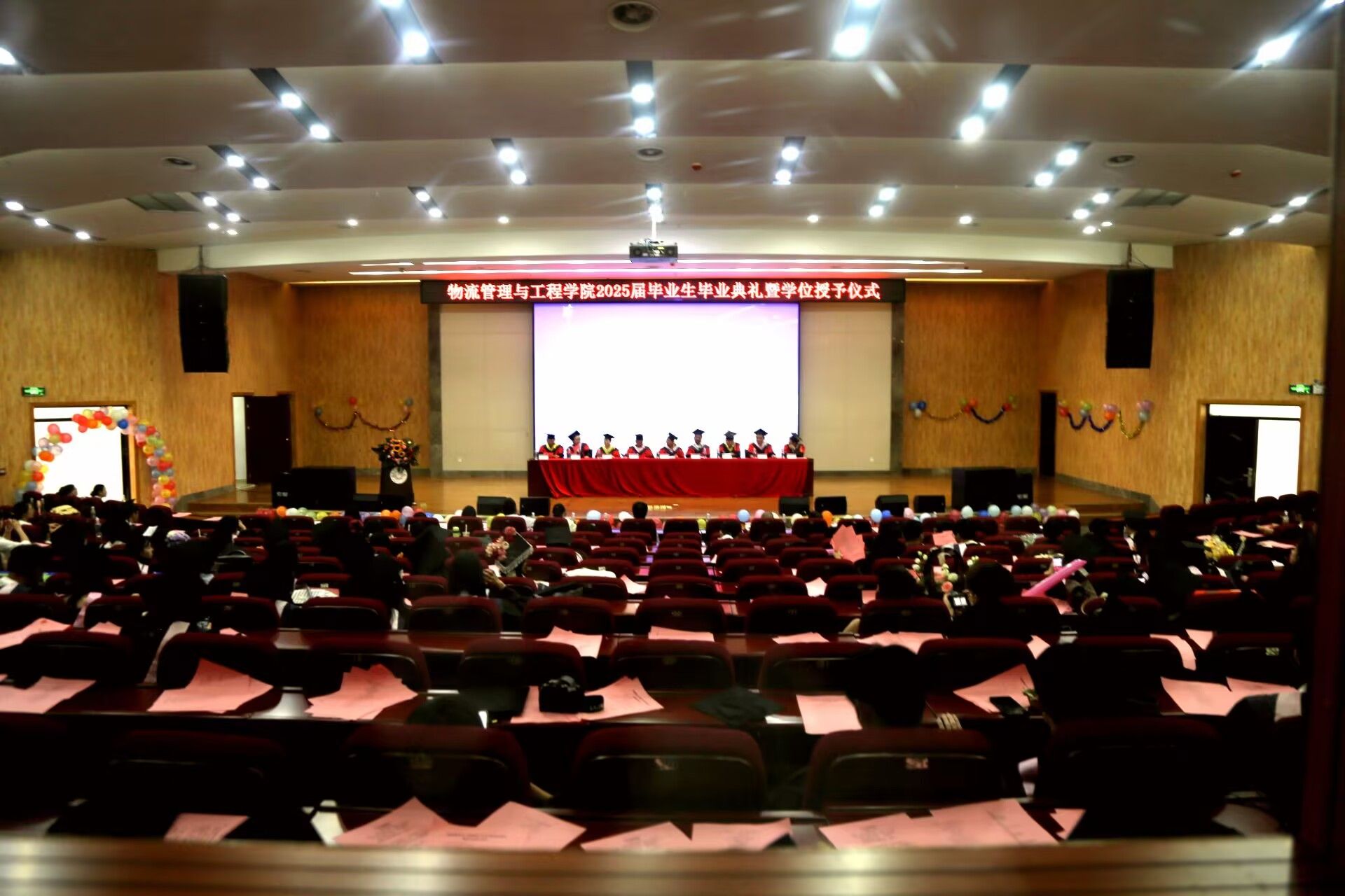 于武鸣校区图书馆报告厅举办2025届毕业生毕业典礼暨学位授予仪式。学院党委书记陈兵、院长汪德荣、党委副书记黄宇、副院长蔡宏果、刘新全、黎英、院长助理李梅、物流管理系主任贺世红、物流工程系主任于晓默、信息工程系主任黄海清、教师代表、学位评定委员会委员、家长代表及2025届毕业生参加典礼,共同见证这一难忘且温馨的时刻。毕业典礼由学院红蜻蜓艺术团胡静萱同学主持。