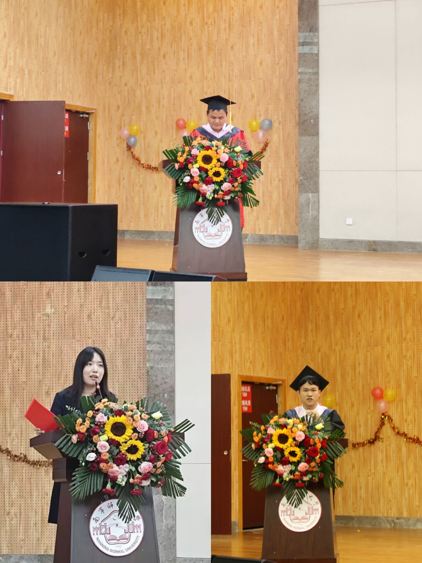 随后,冯娜娜老师代表学院全体教师为毕业生们送上了真挚的毕业祝福,希望同学们在人生新征程上,砥砺前行,扶摇直上九万里。毕业生代表宁成瑜发言,他回顾了在校的学习和生活,感谢母校提供平台,感谢老师教诲与同窗情谊,踏入社会后,他将秉承“德才并育、智行合一”的校训,奋勇拼搏,圆梦理想。