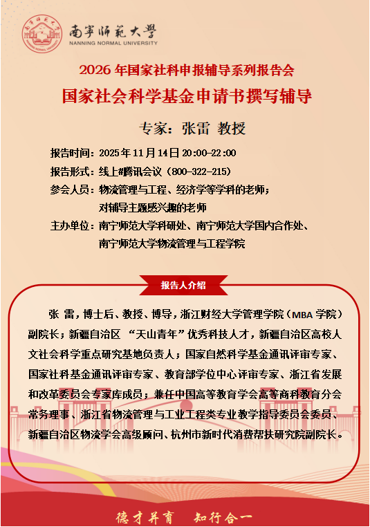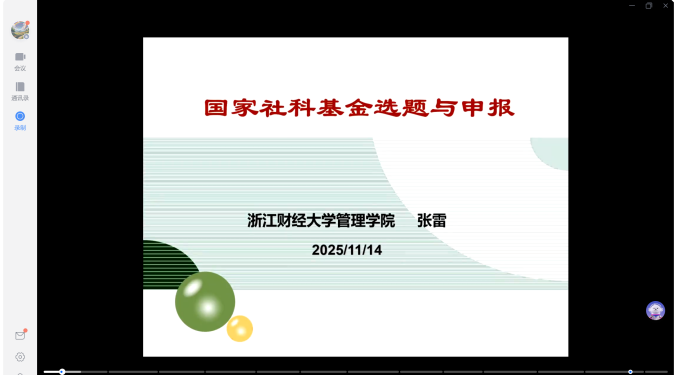 为进一步推进2026年度国家社科基金项目申报工作,提升教师申报的质量和水平,11月14日晚,学院邀请浙江财经大学教授、博士生导师、管理学院副院长张雷教授,通过腾讯会议在线作了题为“国家社会科学基金申请书撰写辅导”的专题讲座,本次讲座是在科研处和国内合作处共同指导下开展的,讲座由科研处徐延宇副处长主持,我校及学院100多位教师在线聆听。