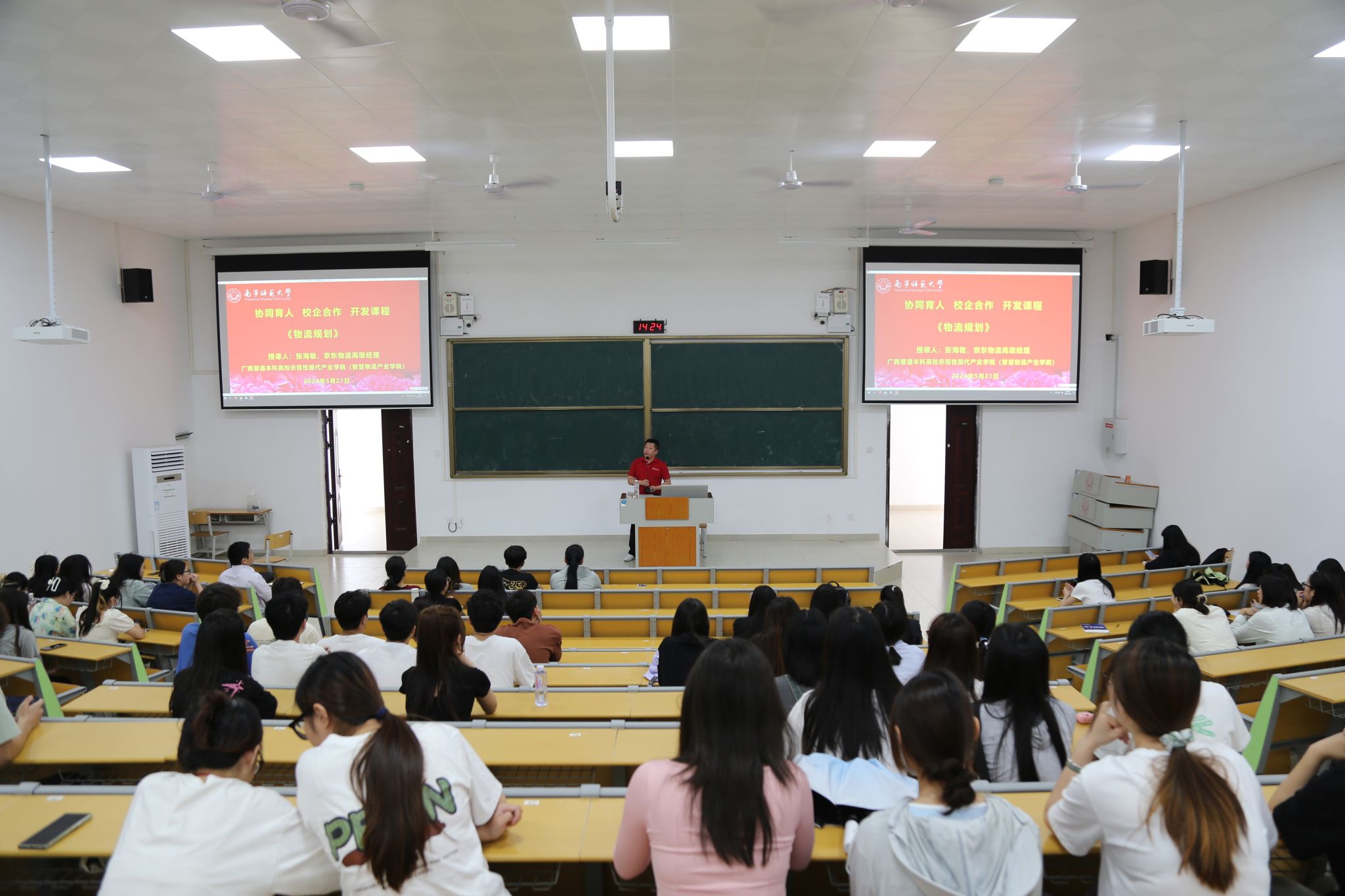 5月21日下午,京东物流华南校企项目组负责人张海敏先生到学校武鸣校区男同视频 为2023级物流管理专业学生进行校企业合作课程《物流规则》的授课,并现场进行了企业实习招聘动员宣讲。男同视频 党委书记陈兵、副院长蔡宏果、辅导员黄奔月老师参加了活动。