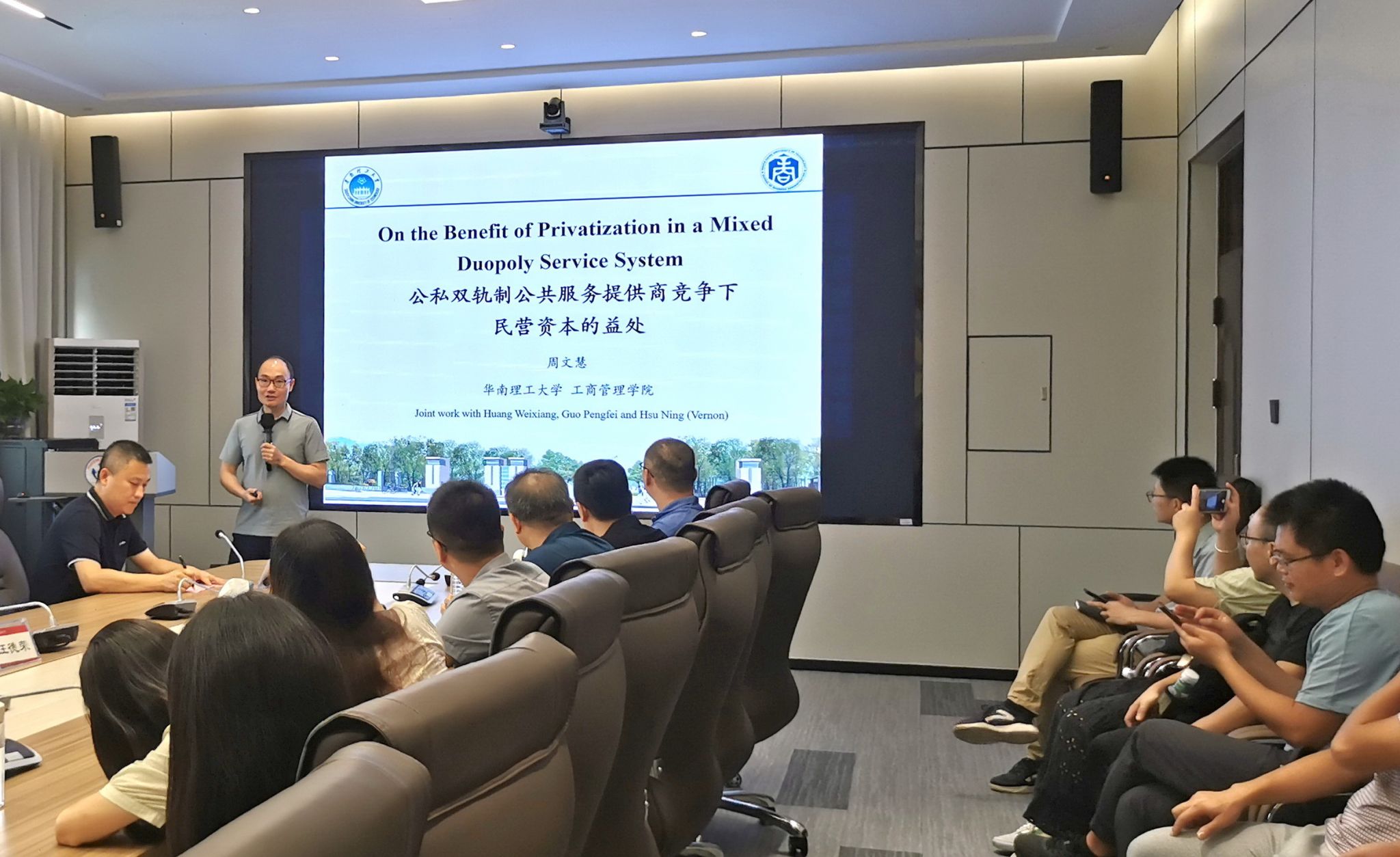 周文慧教授以“公私双轨制公共服务提供商竞争下民营资本的益处”为主题,讲述了在公共服务系统中,公私合作制在引入民营资本,扩大公共服务供给与逐利性和公益性的冲突。他通过以广东的两条快速干线和香港的某私立医院以及国内外的一些建筑等进行分析,结合交通运输领域的布雷斯悖论,对其公私合作制(PPP)的公共服务做出解释,通过数学公式为师生展示在公共服务中公私合作制其中的数据和关系。报告结束后,学院师生与周文慧教授进行了热烈地交流,分享报告中收获的知识,周教授也针对大家提出的问题给予解释和建议。