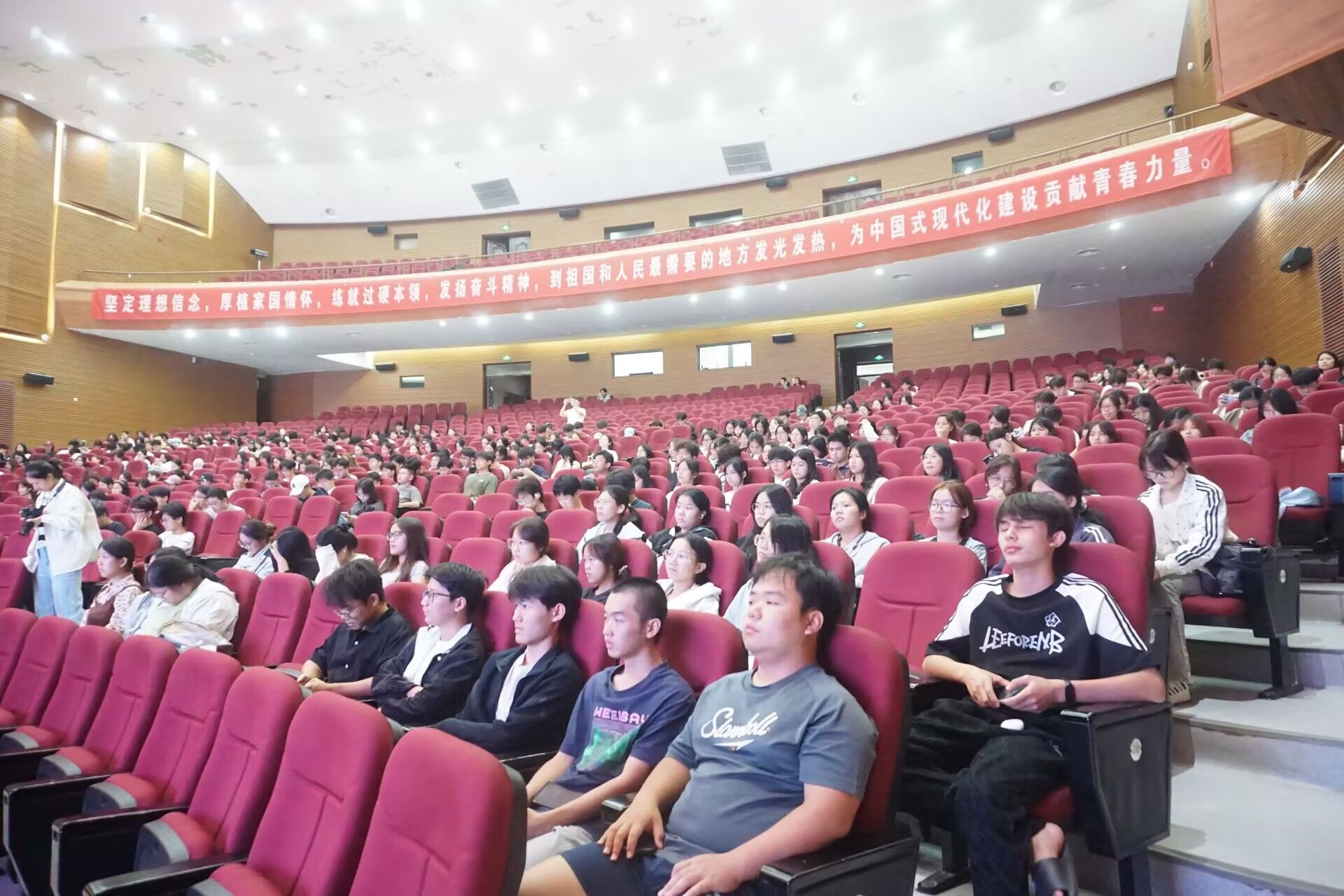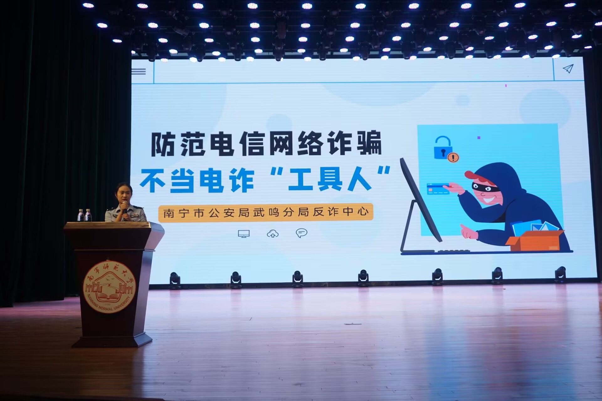 于武鸣校区音舞楼演播厅,面向全体新生举办“防范电信网络诈骗”专题宣讲活动。本次宣讲特别邀请南宁市公安局武鸣分局反诈中心邓警官担任主讲人。